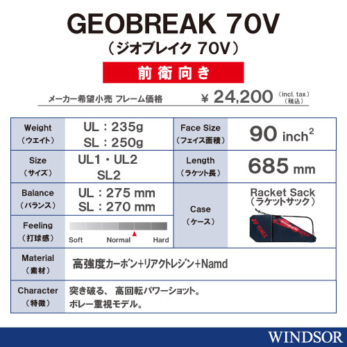 メーカーヨネックス 品名ジオブレイク70V(前衛用) フェイス面積90平方インチ 長さ685mm(5mm SHORT) 平均重量平均235g(UL) 平均250g(SL) バランス平均275mm(UL)平均270mm(SL) グリップサイズUL1・2/SL2 適正テンション25‐35lbs 素材高強度カーボン+リアクトレジン+Namd+VDM 機能1ジャイロバーストシステム 機能2ナイトロフレーム 機能3アームシェイプ 機能4プレーシフトグリップ 機能5トランスウエイトシステム 付属品ケース付 カラーマットホワイト(801) 発売日2022年6月 ガット張り工賃¥1,400(税込) フレームのみ購入時ベイシス132 ホワイト サービス サービスガット当社指定のものよりお選び頂けます。