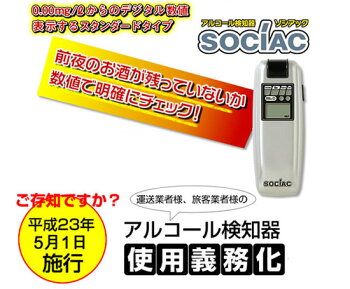 真の安全性確保でモチベーションアップ! ソシアックの主要機能 ●0.00mg/lからのデジタル表示 ●高感度半導体ガスセンサー ●オートオフ機能 ●使いやすいカウントダウン表示 ●LEDによる操作方法表示 ●バッテリー交換お知らせ バス、タクシー、貨物などの事業用自動車における飲酒運転をゼロにするため、平成23年5月1日より、運送業者様・旅客業者様の乗務前の点呼時にアルコール検知器(アルコールチェッカー)の使用が義務づけられています。