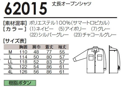機能説明 スペック メーカー 桑和(SOWA) 品番/シリーズ 62015/62010シリーズ シーズン 春夏用 商品名 丈長オープンシャツ 素材 ポリエステル100%(サマートロピカル) カラー (1)ネイビー (5)アイボリー (7)グレー (22)シルバーグレー (23)チャコールグレー サイズ M、L、LL、3L、4L ※3L以降は割り高になります。